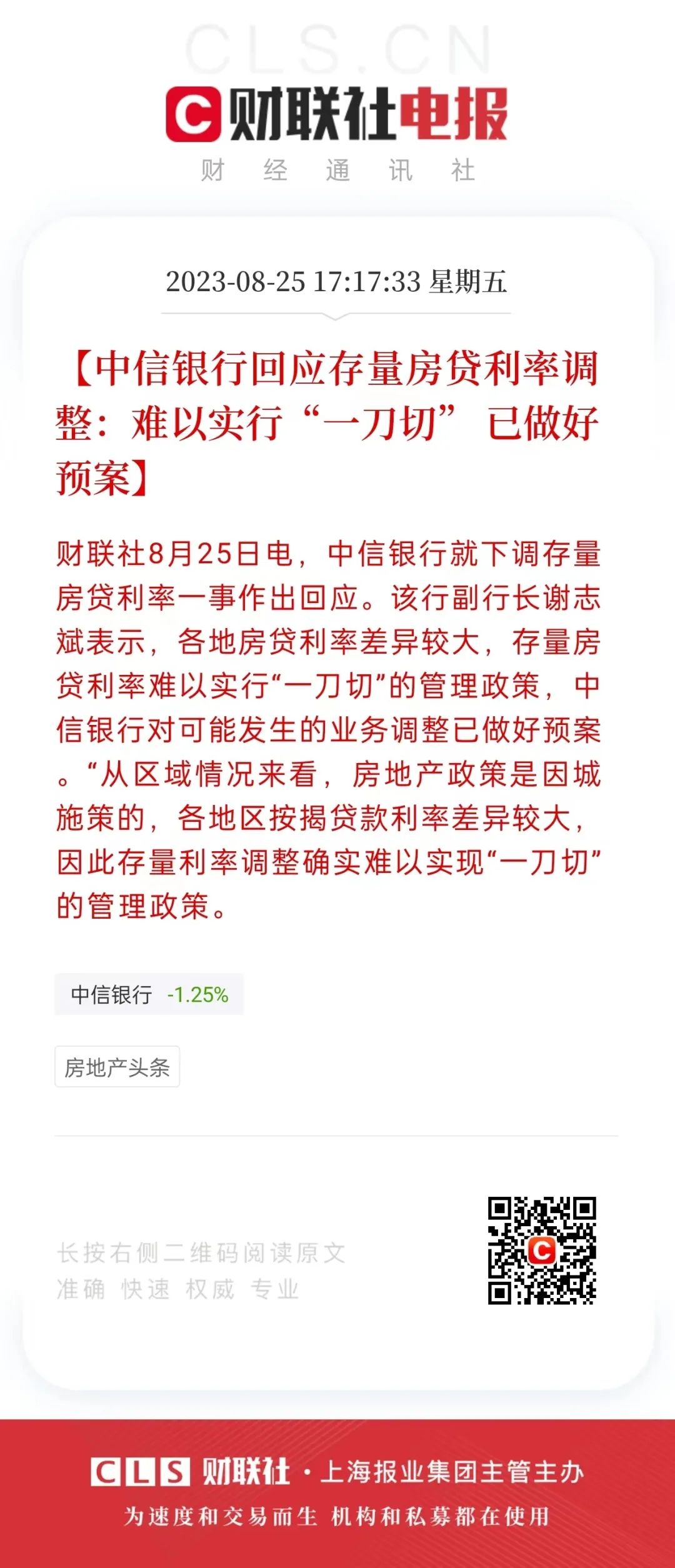 中信银行副行长谢志斌表示,存量利率下调各地房贷利率差异较大,存量房贷利率难以实行“一刀切”的管理政策,中信银行对可能发生的业务调整已做好预案“从区域情况来看,房地产政策是因城施策的,各地区按揭贷款利率差异较大,因此存量利率调整确实难以实现“一刀切的管理政策。