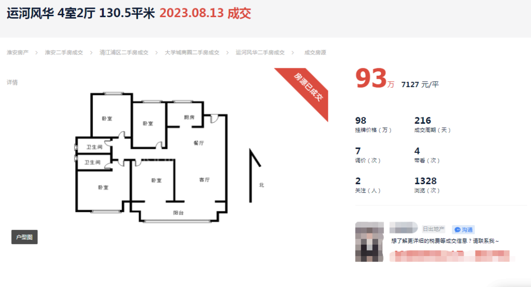 近日,该小区通过贝壳渠道成交了一套二手房,户型建筑面积130.5㎡,成交总价93万,成交单价7127元/㎡。