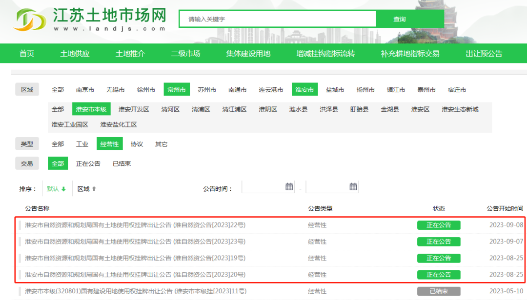 短短3周时间,淮安主城4则土地挂牌公告,共计挂牌经营性用地18宗。