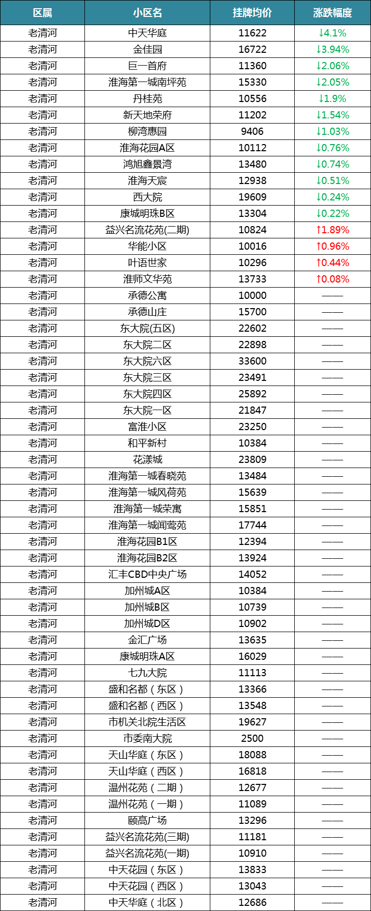 9月份,老清河中统计的54个小区只有16个小区价格有变动,其余均未变化。