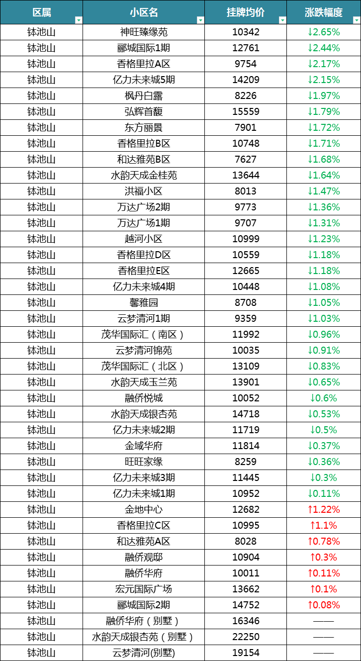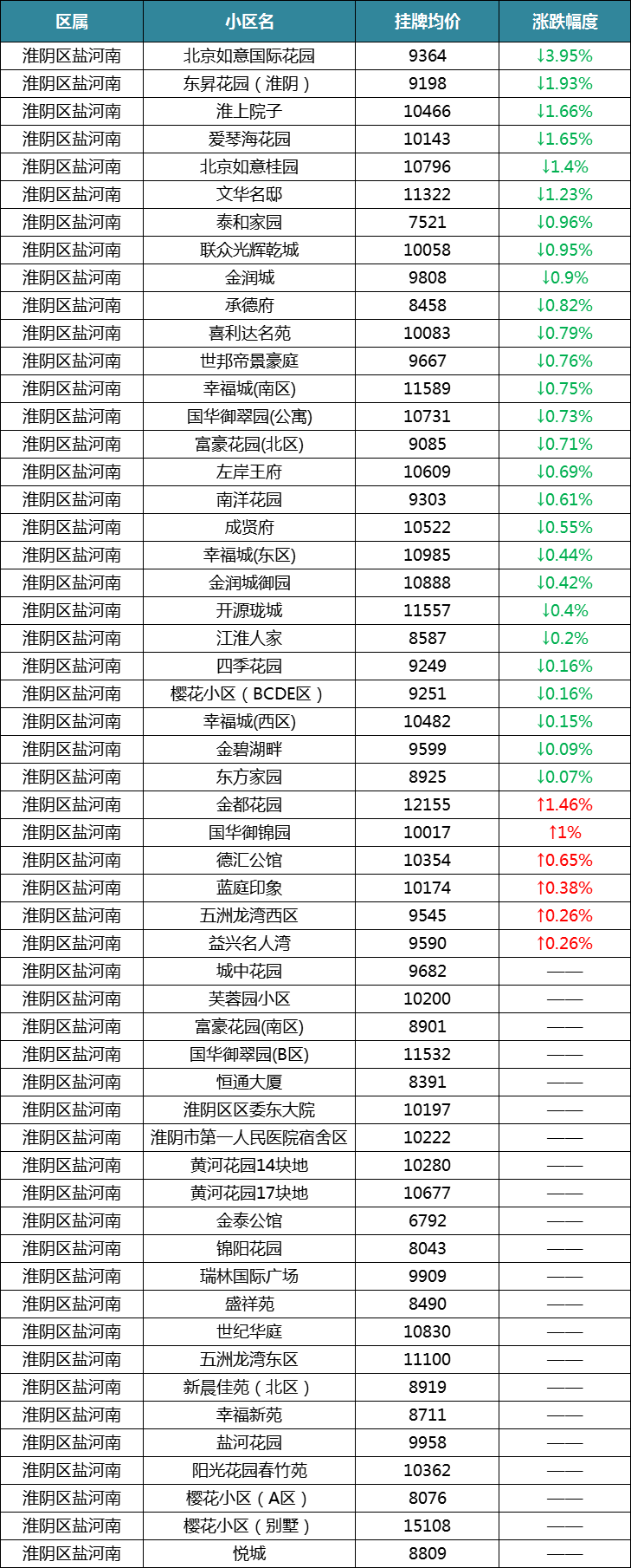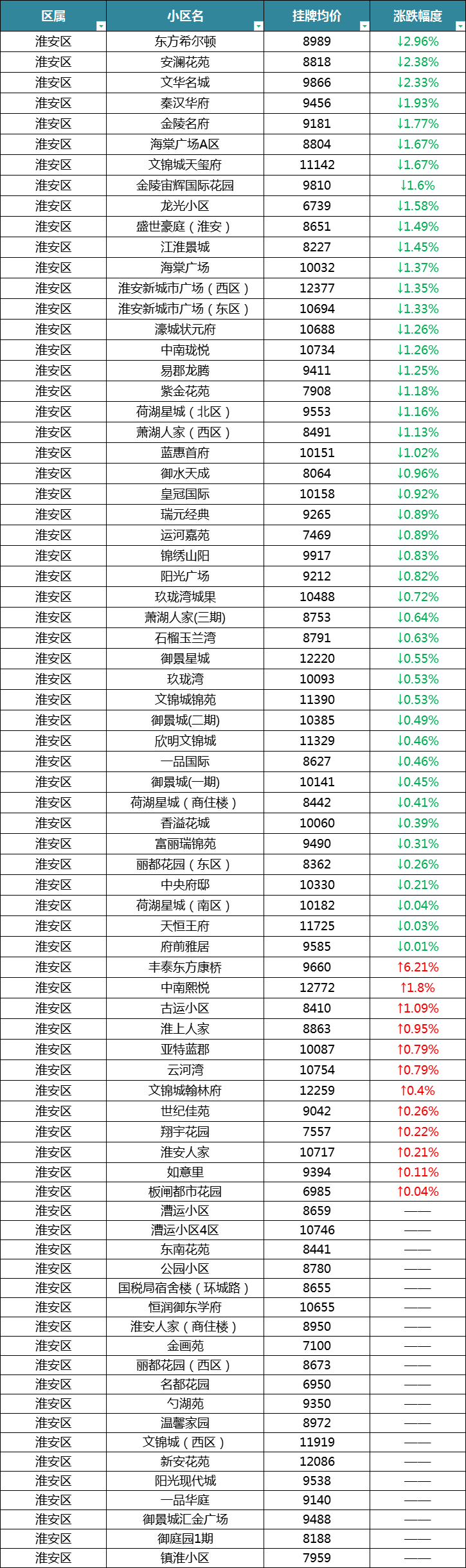 最后来看淮安区,在统计的76个小区中,有45个小区呈下跌趋势,有12个小区呈涨幅,涨幅小区数量还是较多的。