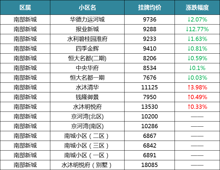 在南部新城,本月跌幅最高的莫过于报业新城一期,相比上月跌了12.77%,目前小区挂牌均价为9288元/㎡。