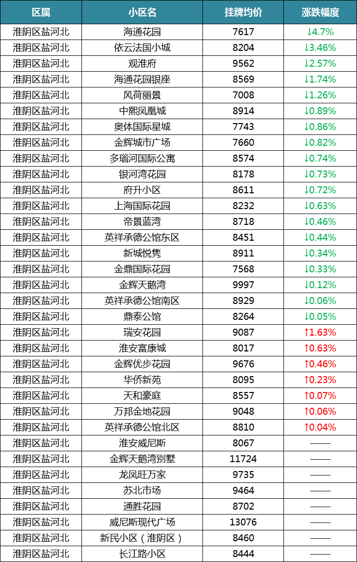 而淮阴区盐河南上个月呈涨幅的小区有3个,本月也上升到6个。