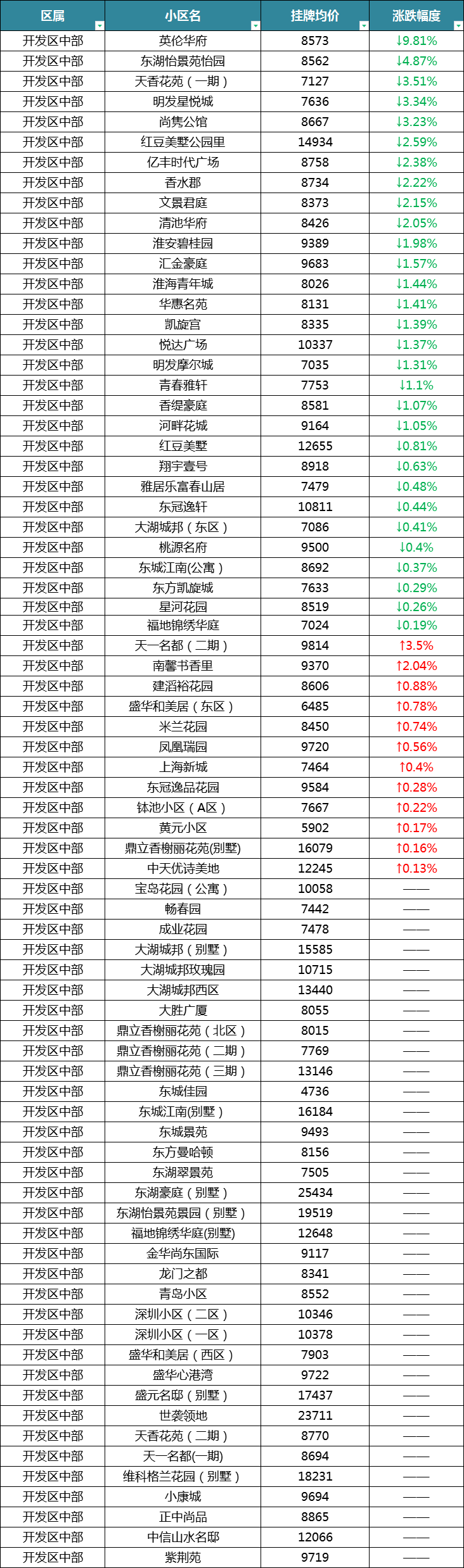 在开发区中部,9月份二手房小区下跌的也是很明显,其中英伦华府跌幅为9.81%,东湖怡景苑怡园跌幅为4.87%。