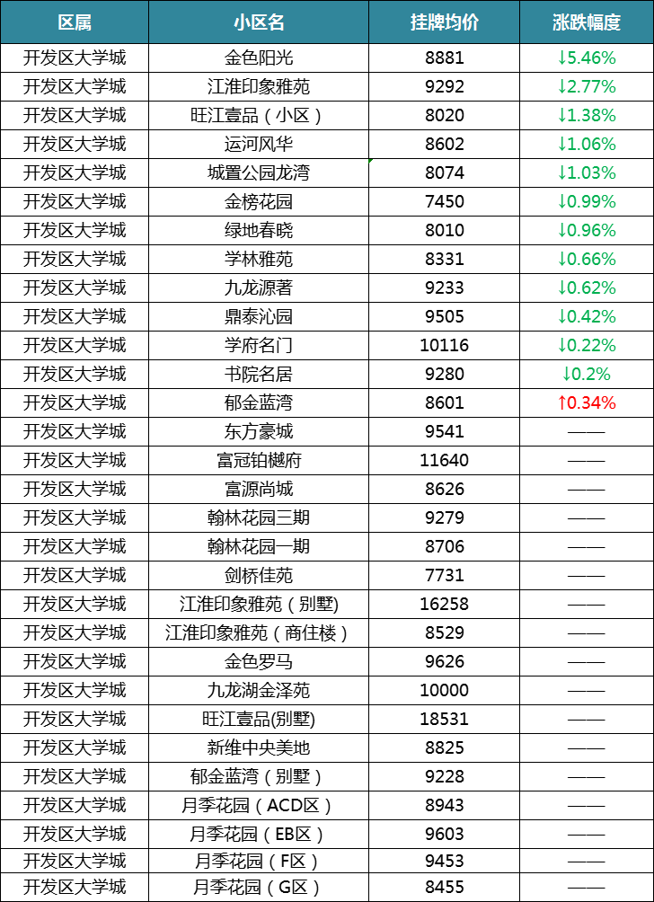 大学城的二手房小区近两个月遇到的不仅是降价小区偏度,而且不少小区也不再活跃,在统计的29个小区中,只有13个小区房价有涨跌幅,其中也只有一个小区上涨。