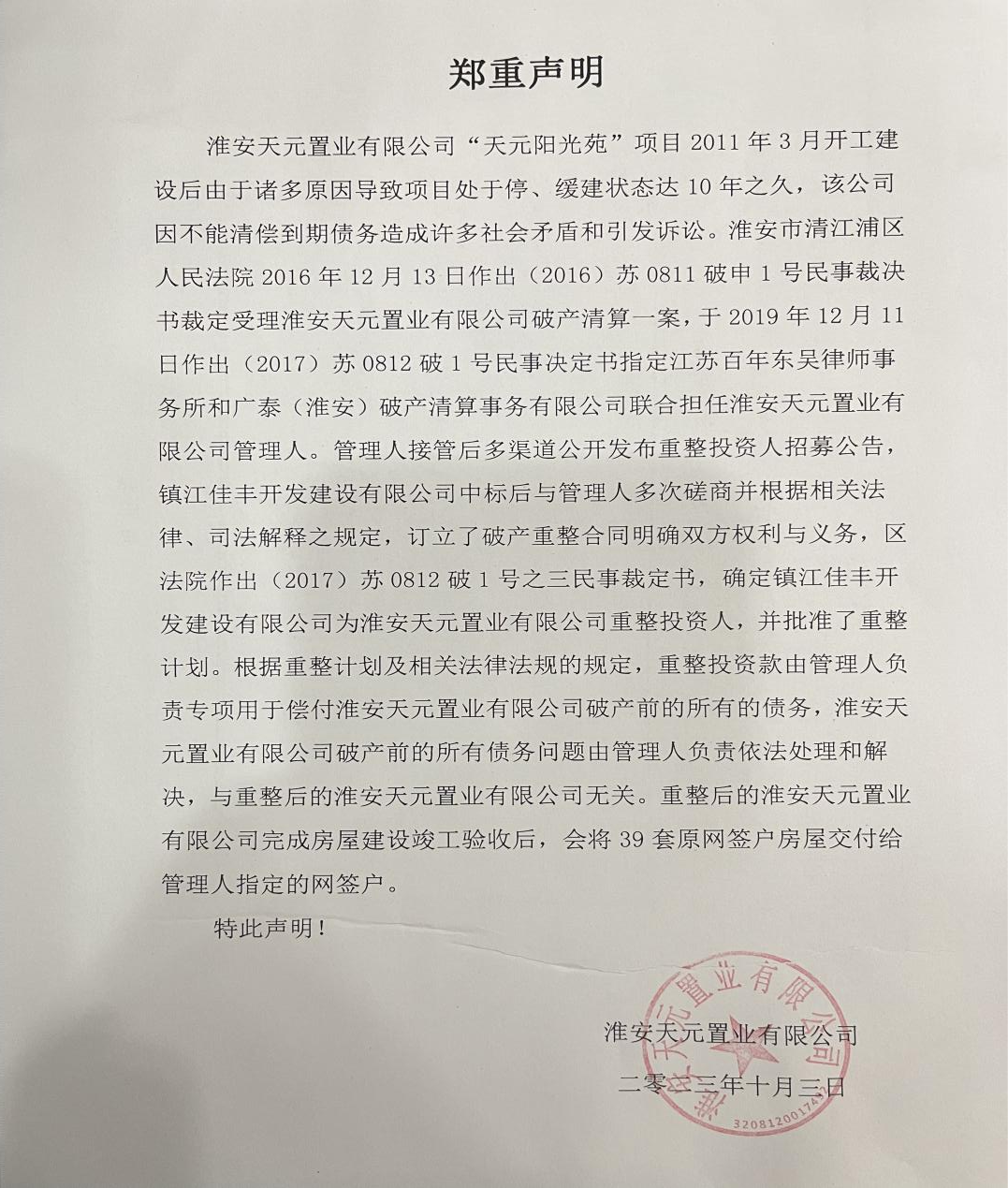 据了解,天元阳光苑项目2011年3月开建,由于诸多原因导致项目缓建、停工。最终,原开发商淮安天元置业有限公司于2016年破产,导致项目彻底烂尾。