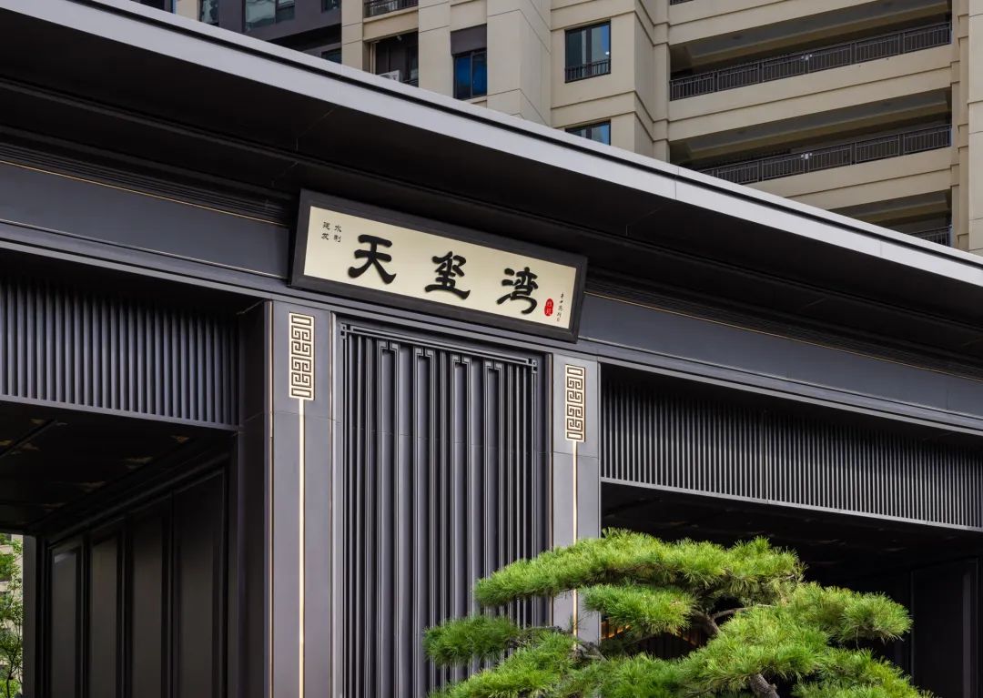 两侧的新中式造型灯具和名家题写的“天玺湾”三个大字,凸显了小区新中式的归家门仪。