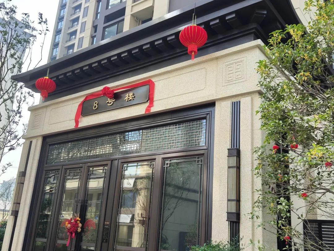 建筑立面飞起的檐角,单元入户的屏风、回字纹,甚至连单元入户门和楼栋的铭牌上,也带着深深的古典气息。