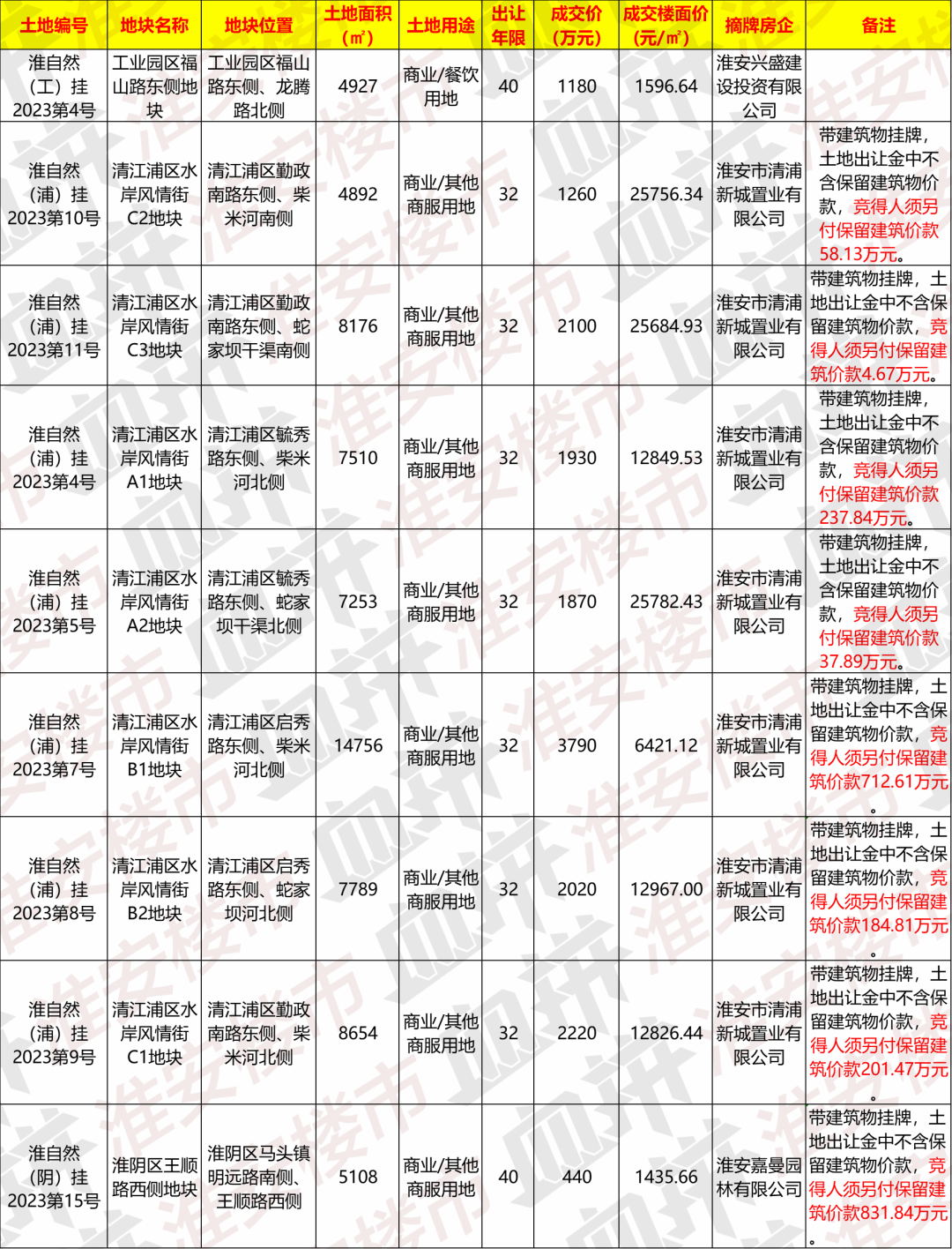 据梳理,此次摘牌的9宗地块中,除了位于工业园区的淮自然(工)挂2023第4号地块外,其余的8宗地块均为带建筑挂牌地块。