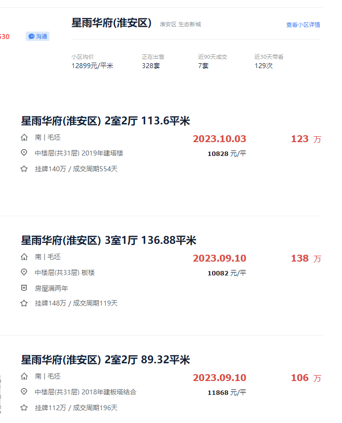 据贝壳找房数据,目前星雨华府小区的二手房挂牌均价12899元/㎡,而实际成交价则普遍在1.1万/㎡左右。