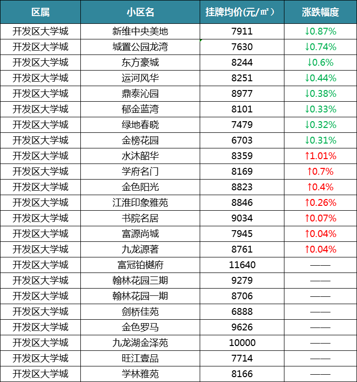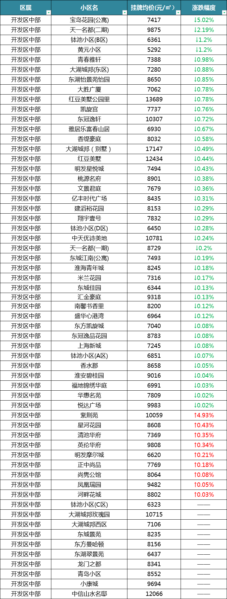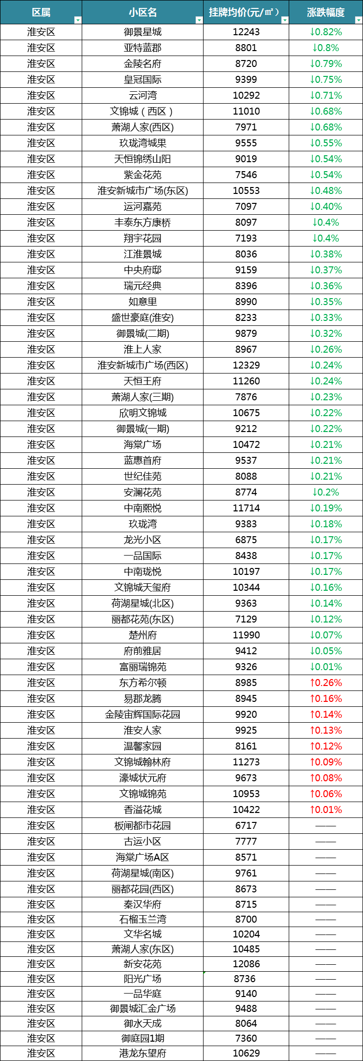 最后是淮安区,在统计的66个小区中,有43个小区呈下跌,有9个小区呈涨幅,16个保持不变。