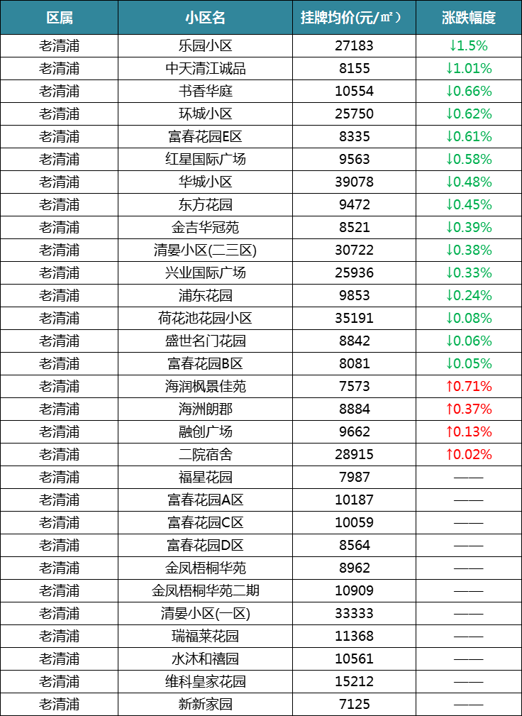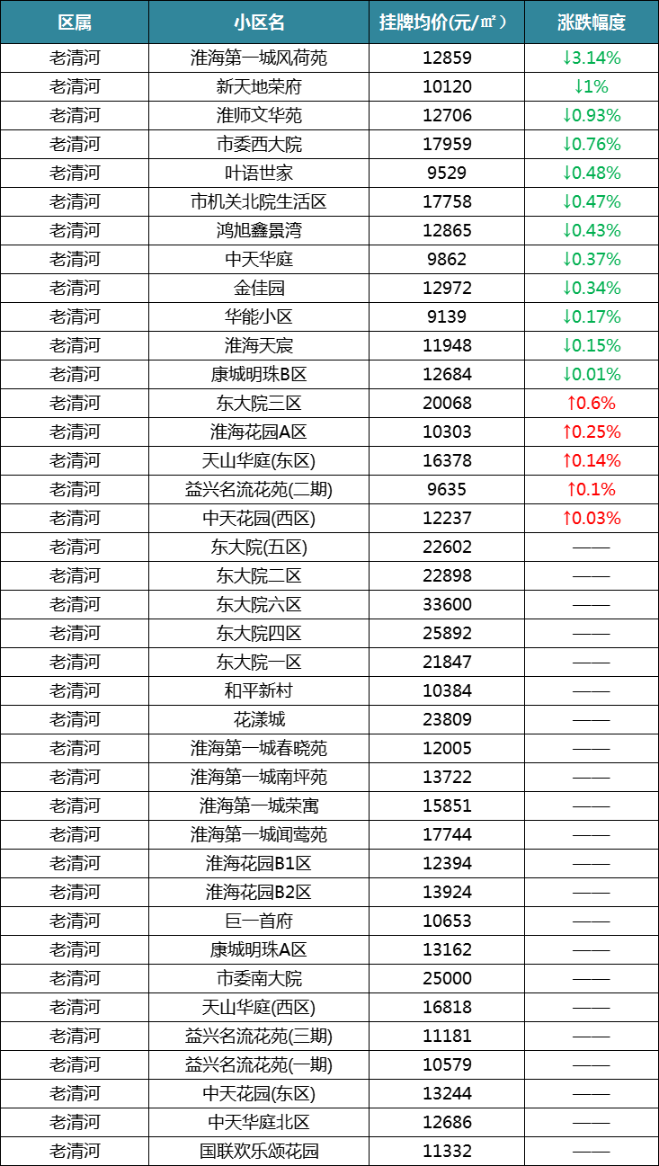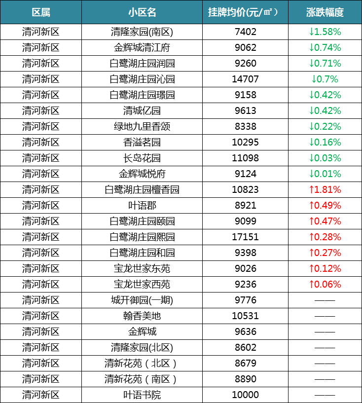 清河老城区统计了39个小区,12个下跌,5个上涨,22个保持不变。