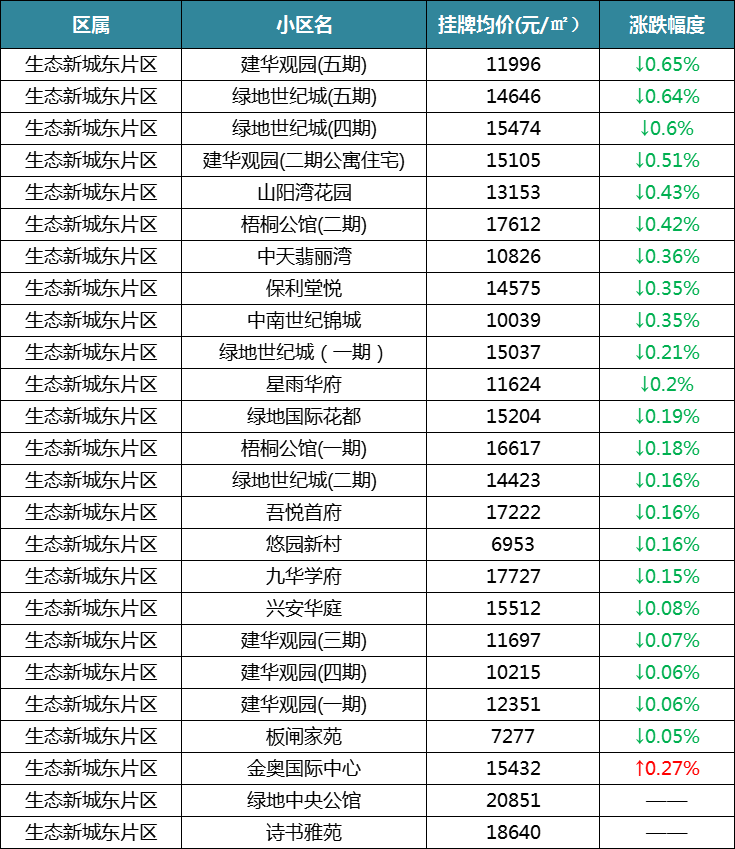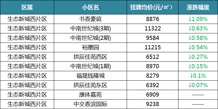 价格在跌,不过降价幅度较小,在生态新城降价很猛的小区已很少见,板块的二手房价格基本较为稳定。