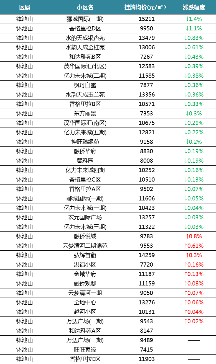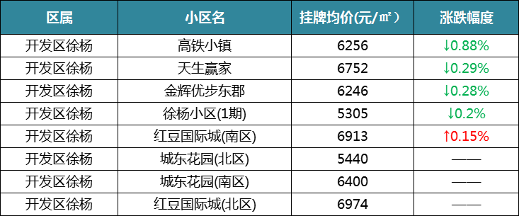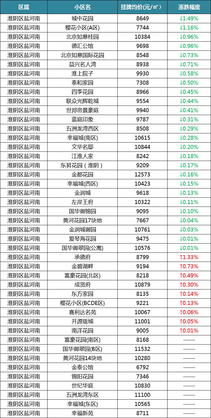 再来看淮阴区盐河北,一共统计了32个小区,13个下跌,10个上涨,8个保持不变。