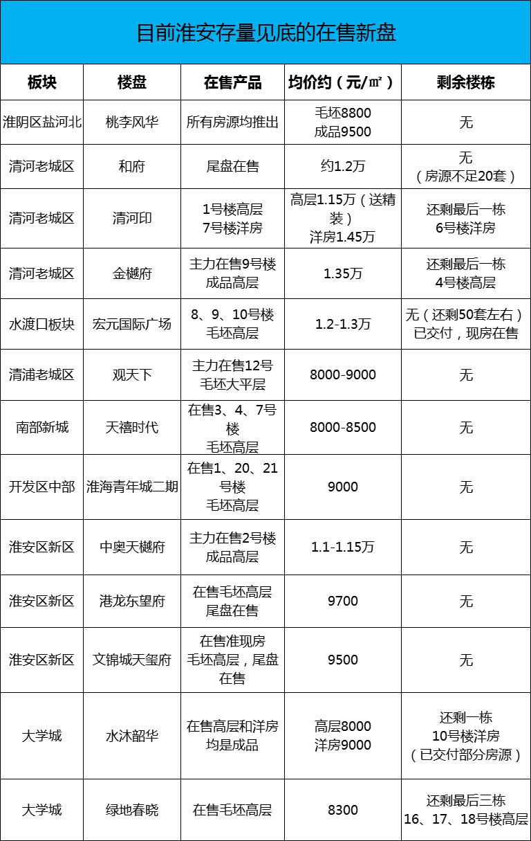 据小编整理,目前淮安有13家在售楼盘的房源已经进入尾声,也许明年上半年结束后,我们将很少听到以下这些楼盘的销售动态。