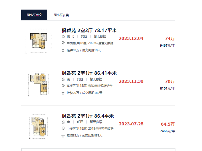 贝壳网站数据显示,枫香苑最近一套成交房源,成交单价为9467元/㎡,虽然比历史成交单价提高了1000+/㎡,但仍然未能突破万元。
