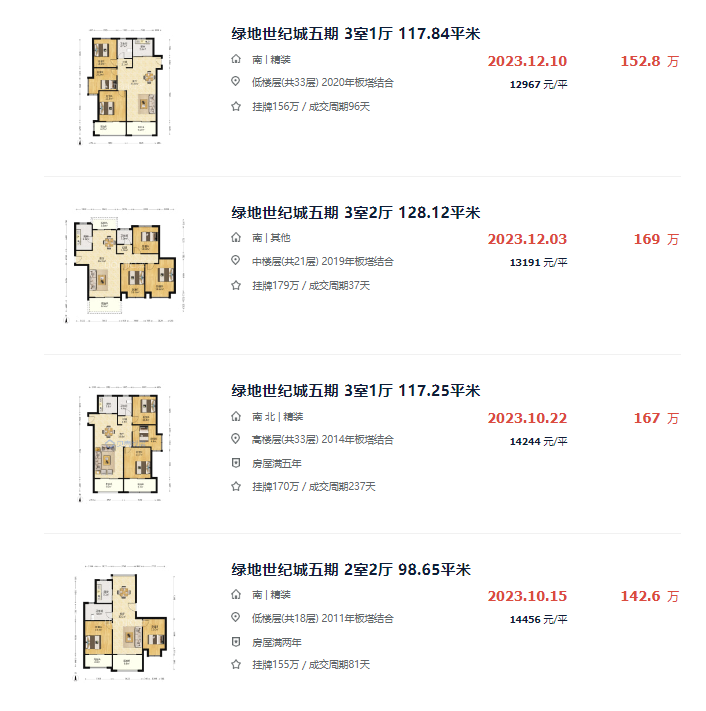 就在本月绿地世纪城5期成交了一套建筑面积约117.84㎡的三房,总价152.8万,成交单价还不足1.3万/㎡。