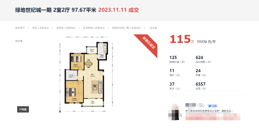 据贝壳网站数据,这套房源位于绿地世纪城一期,建筑面积约97.67㎡,成交总价115万,合成交单价11775元/㎡。