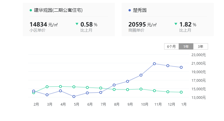 2023年,生态新城唯一上涨的小区,便是建华观园二期。2023年12月和2023年1月相比,挂牌均价上涨了761元/㎡涨幅5.31%。